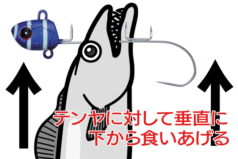 これは、支点が下になることで、タチウオがエサをくわえた時に針が回転し、より早く刺さりやすくなるということ。