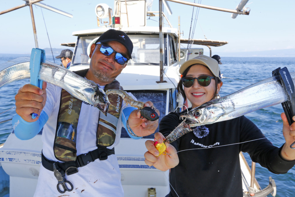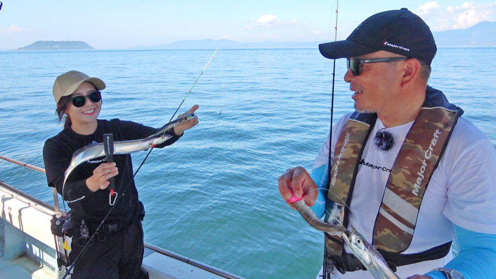 当日、早朝は潮がそこまで速くなく、40号で問題なく真っ直ぐ落ちていく状況。有明海のタチウオ船では、ジギングとテンヤどちらの釣り方でもOKで、船中ファーストヒットはジグ。その様子を見て、2人はジギングの誘いのキホンである「ワンピッチジャーク」で誘ってみると、当たりの誘いだったようで良型を含めて連発!