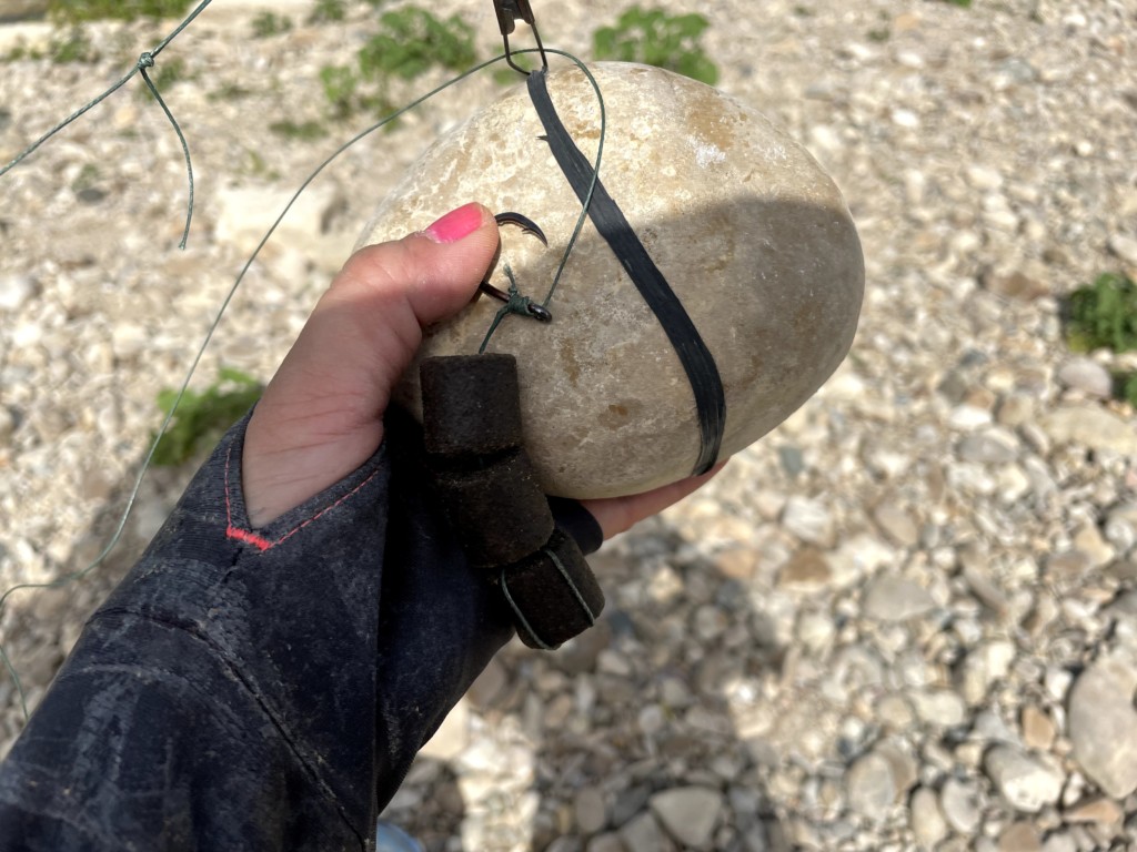 仕かけは、ペレット3個付け。転がっている1kgぐらいの石をオモリにする。石だと、外れた時も自然に優しい。竿に鈴を付け、魚がアタれば、鈴が鳴る。開始から2時間半、鈴が鳴り出し、竿先が激しく叩き出した。