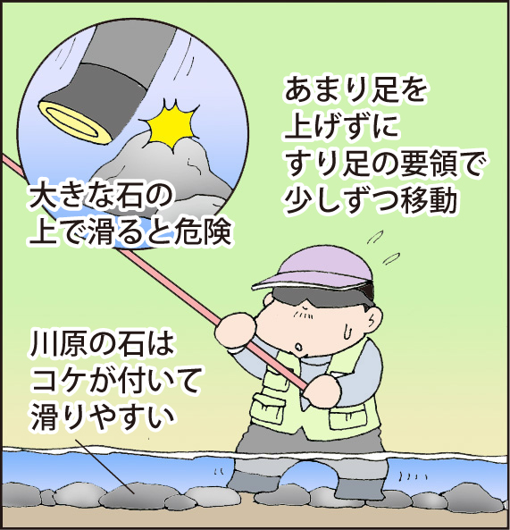 アユのポイントは、もちろんアユのエサとなるコケが石にたくさん付いている。実はこのコケが滑りやすいんです。川に入っていく時には、すり足の要領で、歩幅を狭くゆっくりと進んでいくこと。特に釣っている最中は足下に注意ができ辛いので、足で探りながら移動しよう。