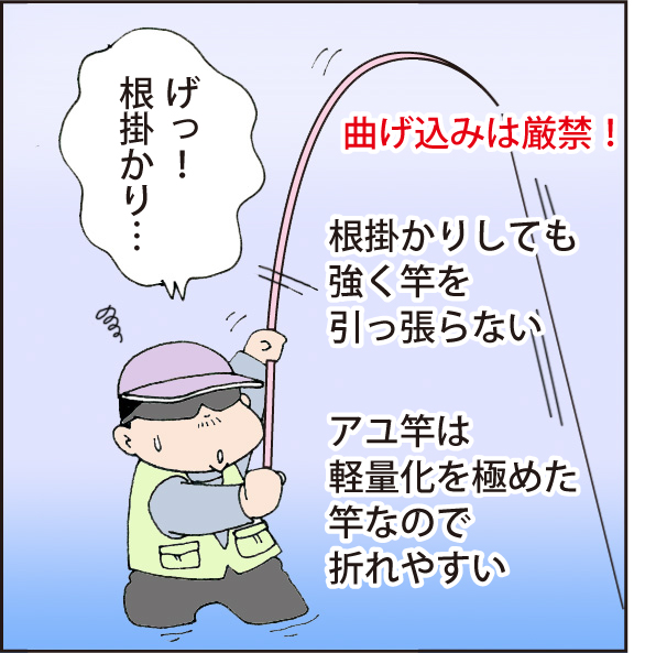 アユ竿は軽量化に特化した竿で、強度はそれ程ありません。川底に引っ掛かったからと言って、竿で強くあおるといとも簡単に折れてしまいます。また、河原に不用意に寝かせて傷が入っても折れる原因になるので、扱いには最新の注意を払いましょう。