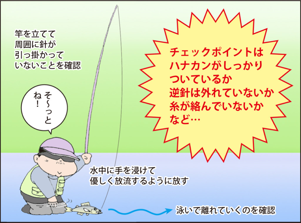 この時に、ハナカンはしっかりと通っているか、逆針は外れていないか、そのほか糸絡みなどがないかを見ておくこと。水中に放されたオトリをしっかりと目で追って、元気に泳いでいるかどうかを確認することも大切です。