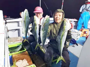 舞鶴沖は半夜で狙う五目釣りで十分な土産が釣れています。アジ25~35cm、サバ、チダイ、レンコダイをメインに、夕まずめからはメジロやハマチが連発し、強引が楽しめます。