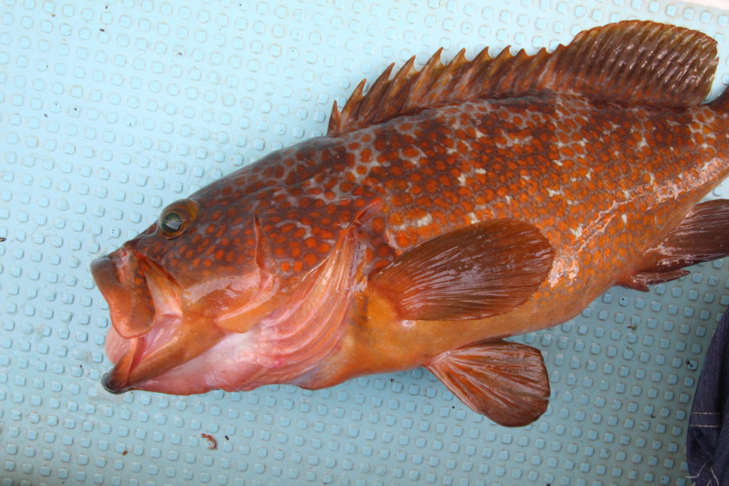 網野沖では、生きアジエサのノマセ釣りで根魚が土産になっています。メインはアコウで30~40cmが上がり、ほかにガシラやアオハタ30cm前後、マトウダイ40cm前後などが上がっています。