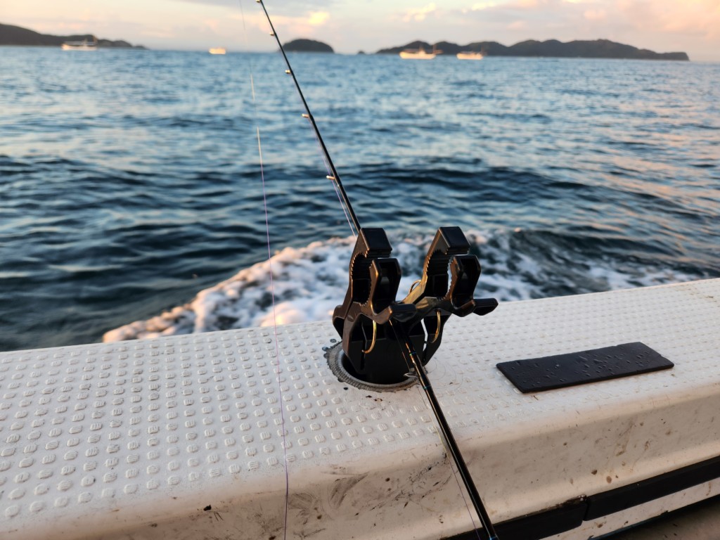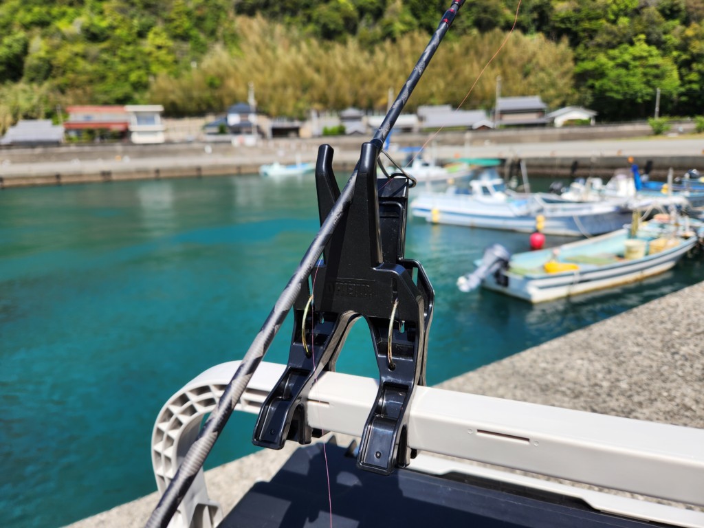 船釣りでは、船べりのロッドスタンドに差し込み、揺れても倒れない竿掛けに変身。手すりなどがあれば、予備のタックルを洗濯バサミのように挟んで、置いておくことも可能です。