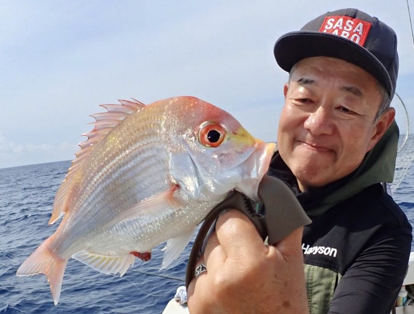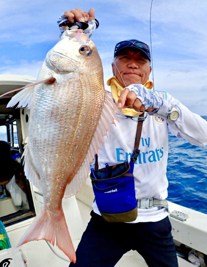 ところが、次の瞬間に痛恨のフックアウト。今度は、左隣の黒笹氏のロッドが引き込まれた。これも明らかにマダイ。存分に引きを楽しみ、誇らしげに釣り上げたのは50cm前後のマダイだった。