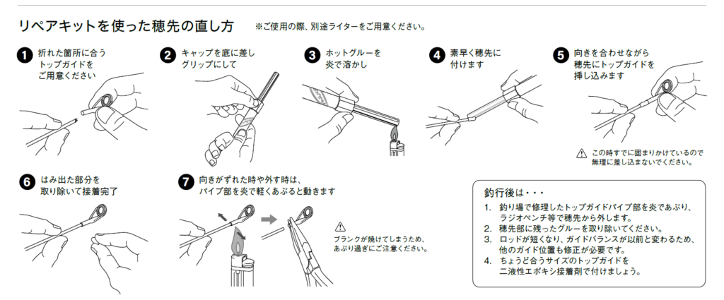 簡単に言うと、折れた穂先に合うガイドを用意し、火で溶かしたホットグルーを付け、新しいガイドを装着するってことです。