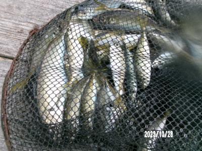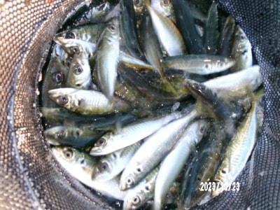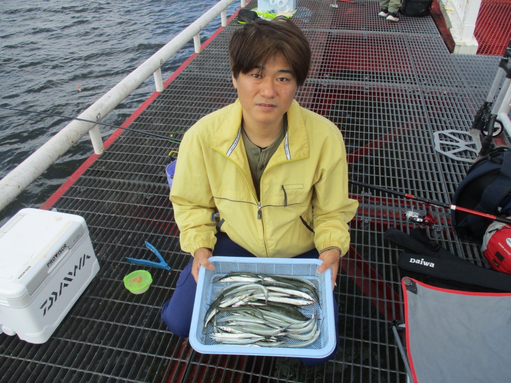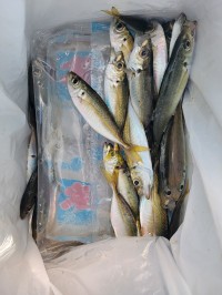 アジ16~22cm18尾、小アジ11~15cm130尾、豆アジ7~10cm70尾、サバ16~25cm130尾、サッパ12~15cm200尾、カタクチイワシ8~10cm30尾、サヨリ15~26cm500尾、チヌ28~45cm4尾、スズキ60cm、メジロ63cmと62cm。