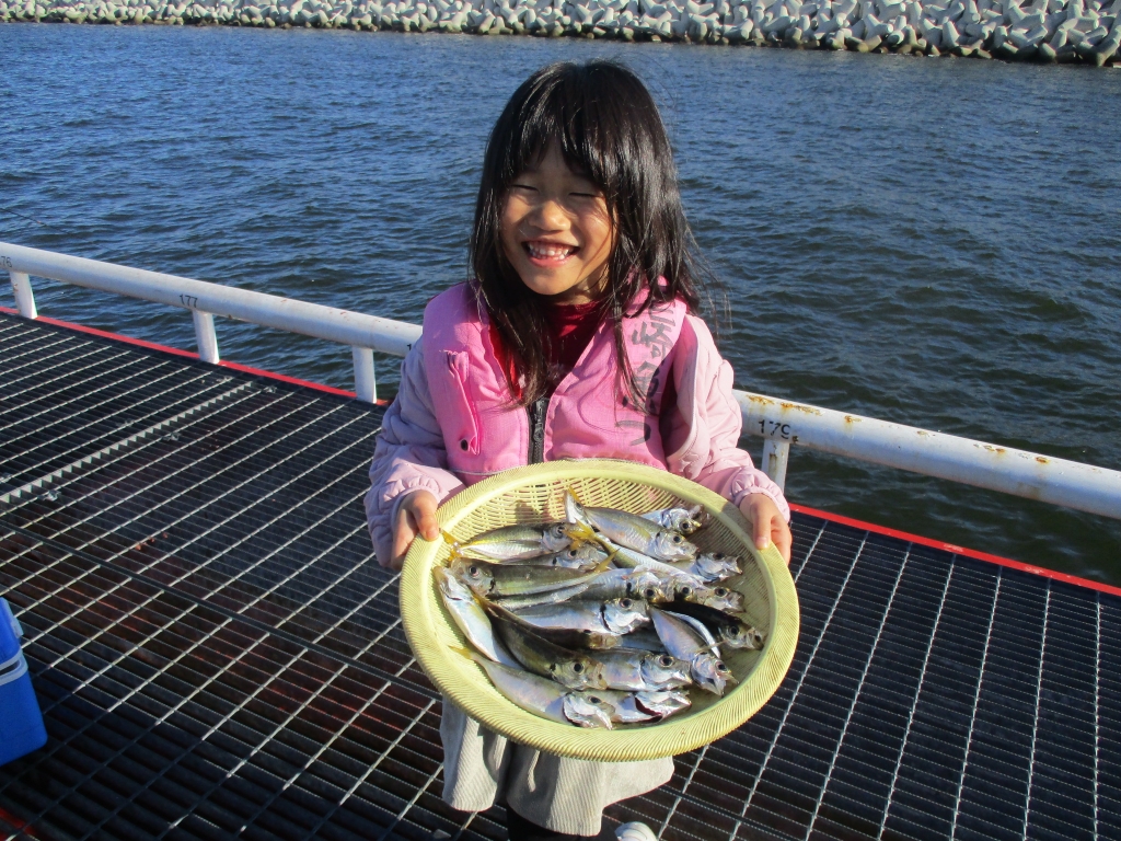 アジ16~22cm40尾、小アジ11~15cm370尾、豆アジ7~10cm50尾、サバ16~25cm200尾、サッパ12~15cm30尾、サヨリ15~23cm300尾、サンバソウ19cm、ガシラ20cmと14cm、チヌ35cmと25cm、スズキ66~83cm4尾、チヌ20cm、カワハギ21cm、コショウダイ22cm。