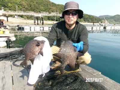 メジロ63cm2尾、スズキ58cm、メバル25cm、カワハギ22cm頭に14尾、ウマヅラハギ28cmと27cm、アオリイカ、マダイ39cm頭に3尾、小ダイ22尾、グレ34cm頭に8尾、チヌ43cm、ヒラメ40cm、タチウオ、アジなど。