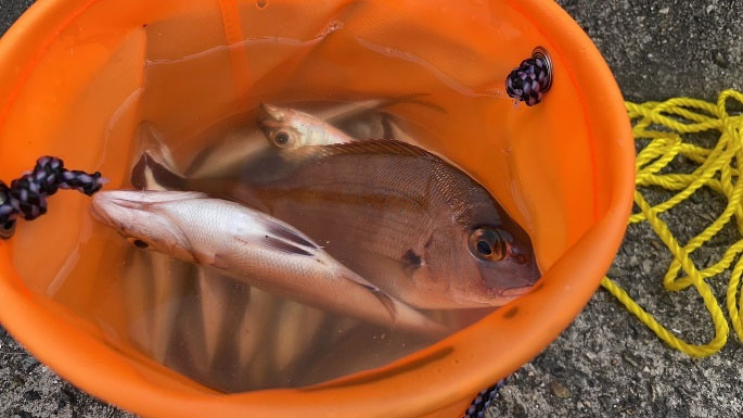 この時期は、沖向きではシラサエビのエサでマダイも狙えます。窪んだ入り江のような場所では、サビキでアジはもちろん、夜はタチウオと大型のサバが狙えます。