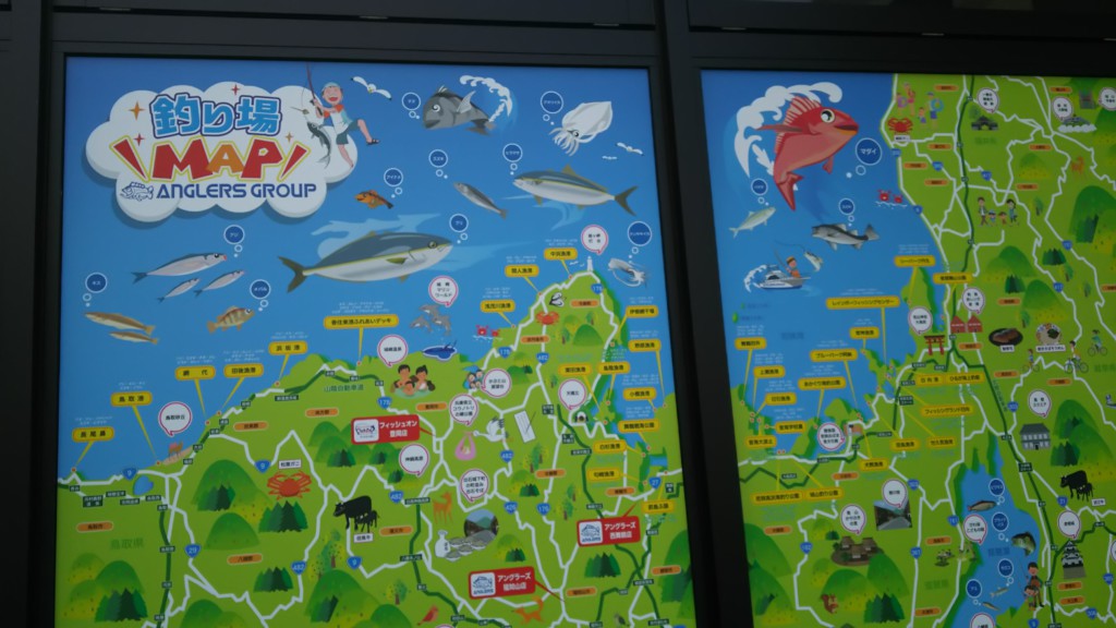 ▲店舗入り口横には周辺の釣り場マップが大きく掲示してある